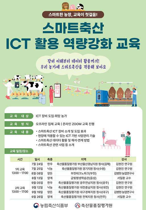 축산물품질평가원(원장 박병홍)은 스마트축산 장비 도입 및 희망 농가를 대상으로 7월 24일부터 9월 26일까지 ‘스마트축산 정보통신기술(ICT) 활용 역량 강화’ 교육을 총 8회 진행한다고 밝혔다.