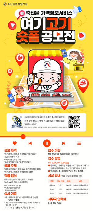 축산물품질평가원(원장 박병홍)이 11월 17일부터 12월 8일까지, 국민이 쉽고 재미있게 ‘여기고기’ 서비스를 접할 수 있도록 쇼트폼 공모전을 개최한다. ‘여기고기’는 소비자 주변 축산물 판매장 가격과 지역 평균 시세를 한눈에 보여주는 위치 기반 축산물 가격정보 서비스다.