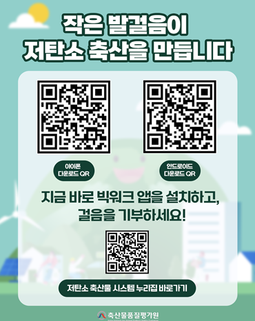 축산물품질평가원은 ‘저탄소 축산물 인증제도’의 가치를 전 국민과 공유하기 위해 지난 9월 22일부터 ‘저탄소 축산물 걸음 기부 캠페인’을 진행했다. 참여자는 걸음 기부 어플(빅워크)을 통해 기부에 쉽게 동참할 수 있다.