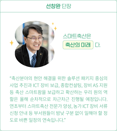 스마트축산지원단 선창완 단장은 “스마트축산 사업의 안착으로 축산농가의 생산단계에서부터 축산물의 유통까지 국민에 대한 안정적인 먹거리 제공이 선순환될 수 있도록 하는 게 우선 목표” 라면서 부서장으로서의 각오를 소개했다. 이어 “스마트축산은 농가의 인건비 절감과 에너지 효율 등으로 인한 생산성 향상, 축사의 악취 저감을 통해 우리 축산업의 경쟁력과 축산인의 삶의 질을 한층 더 높이는 계기가 될 것”이라고 강조했다.