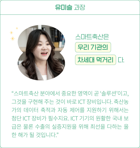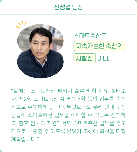 환경을 더욱 공고히 하는 역할이 추가되었다. 올해 1월에는 축평원 내에 스마트축산 관련 사업을 이끌고 지원하는 부서 ‘스마트축산지원단’이