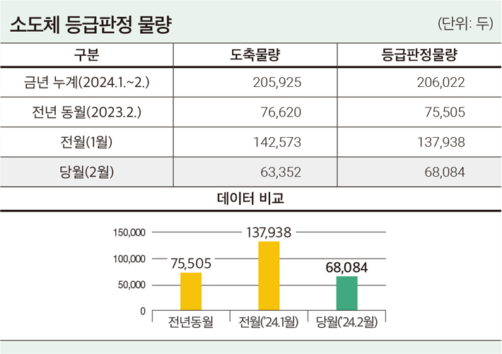 -2월 등급판정률은 2024년 전국 도축두수(농림축산검역본부) 80두 대비 40.0% 판정