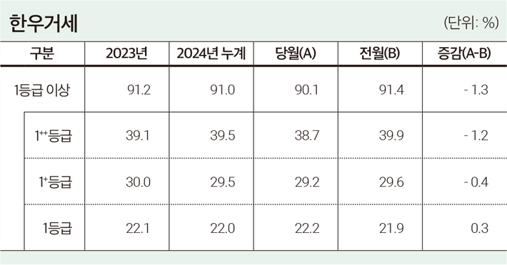 • 한우 육질 1등급 이상 출현율은 76.2%로 전월(77.3%) 대비 1.1%p 감소