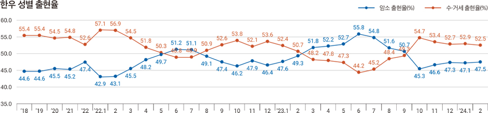 • 한우 수·거세 출현율은 52.5%로 전월(52.9%) 대비 0.4%p 감소