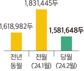 • 2월 등급판정물량은 1,581,648두로 전월(1,831,445두) 대비 13.6%(249,797두) 감소, 전년 동월(1,618,982두) 대비 2.3%(37,334두) 감소