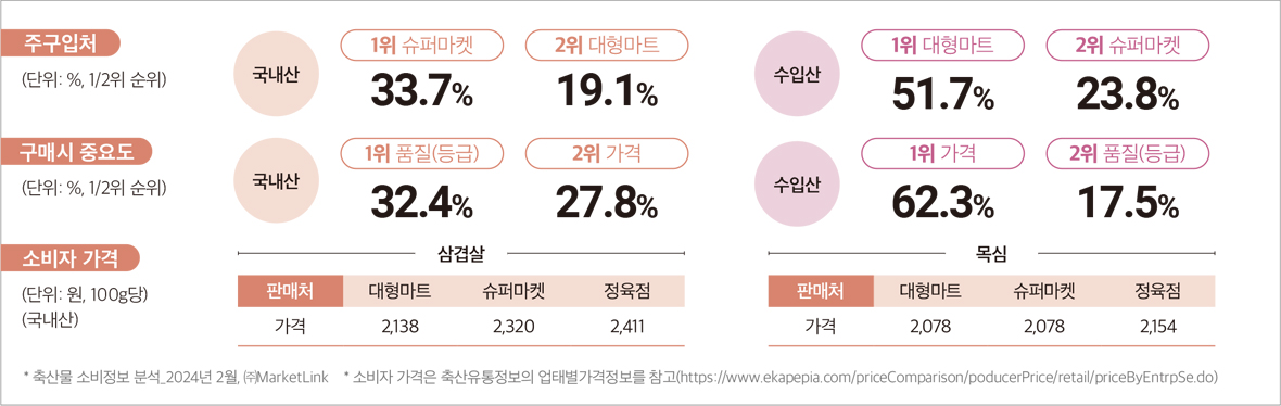 •국내산은 주로 슈퍼마켓에서 구매하며 품질(등급)이 중요, 수입산은 주로 대형마트에서 구매하며 가격이 중요