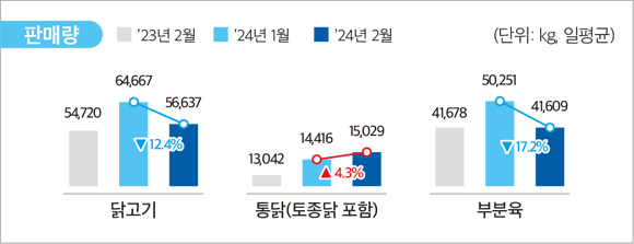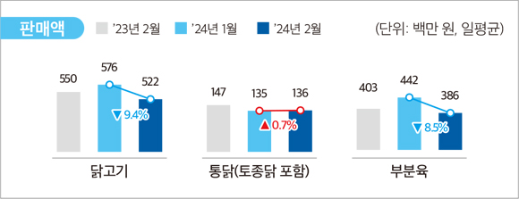 •2024년 2월 기준 전체 닭고기 판매량은 전월 대비 12.4% 감소, 판매액은 9.4% 감소