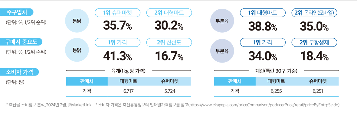 •통닭은 주로 슈퍼마켓, 대형마트에서 구매하며 가격이 중요, 부분육은 대형마트(모바일)에서 주로 구매하며 가격, 신선도, 무항생제 여부가 중요