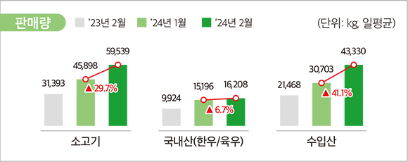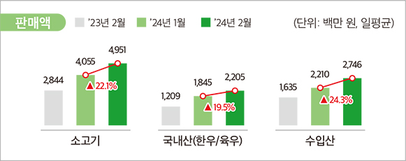 •2024년 2월 기준 전체 소고기 판매량은 전월 대비 29.7% 증가, 판매액은 22.1% 증가
