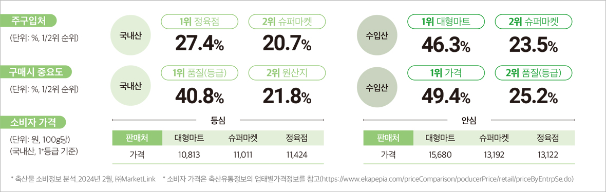•국내산은 주로 정육점에서 구매하며 품질(등급)이 중요, 수입산은 대형마트에서 주로 구매하며 가격이 중요