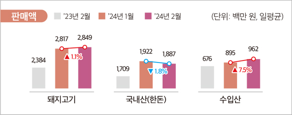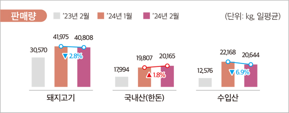•2024년 2월 기준 전체 돼지고기 판매량은 전월 대비 2.8% 감소, 판매액은 1.1% 증가