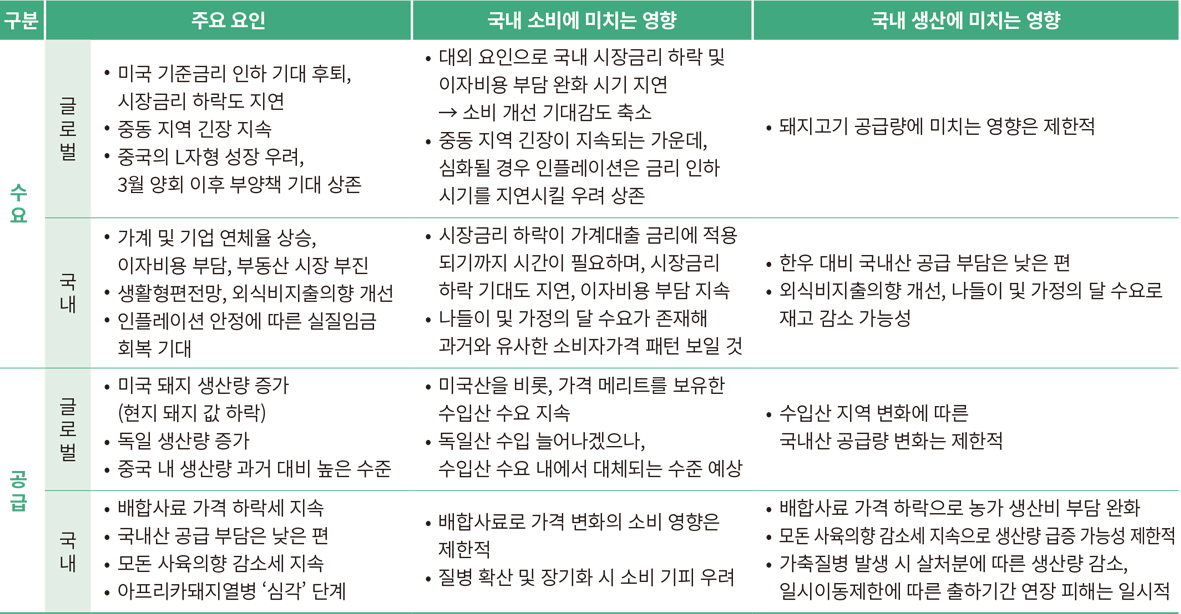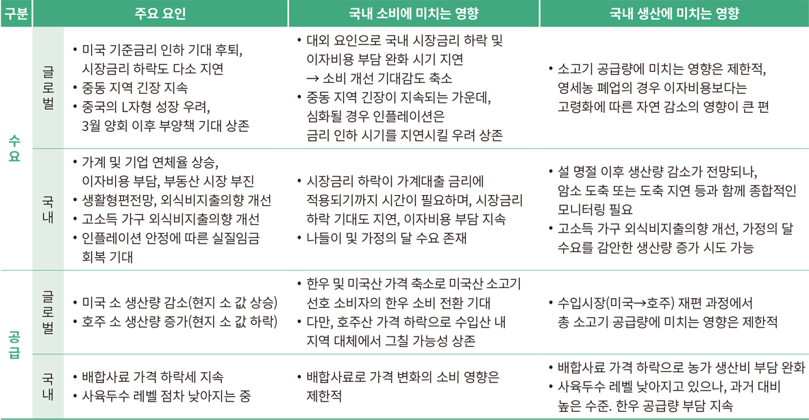 * 농림축산식품부와 축산물품질평가원에서는 축산물의 수요와 공급, 가격 예측 고도화를 위해 경제·금융 분석 전문기관인 NH투자 증권과 협업하여 축산업을 거시적으로 분석하는 연구 사업을 진행 하고 있습니다. 한우와 양돈산업 및 축산업 이슈와 기업 동향 등에 대해 매월 주제별 보고서를 발간하고 있으며, 보고서의 전체 내용은 축산유통정보 누리집(www.ekapepia.com) 정보자료실 내 KAPE 보고서 메뉴에서 확인할 수 있습니다.